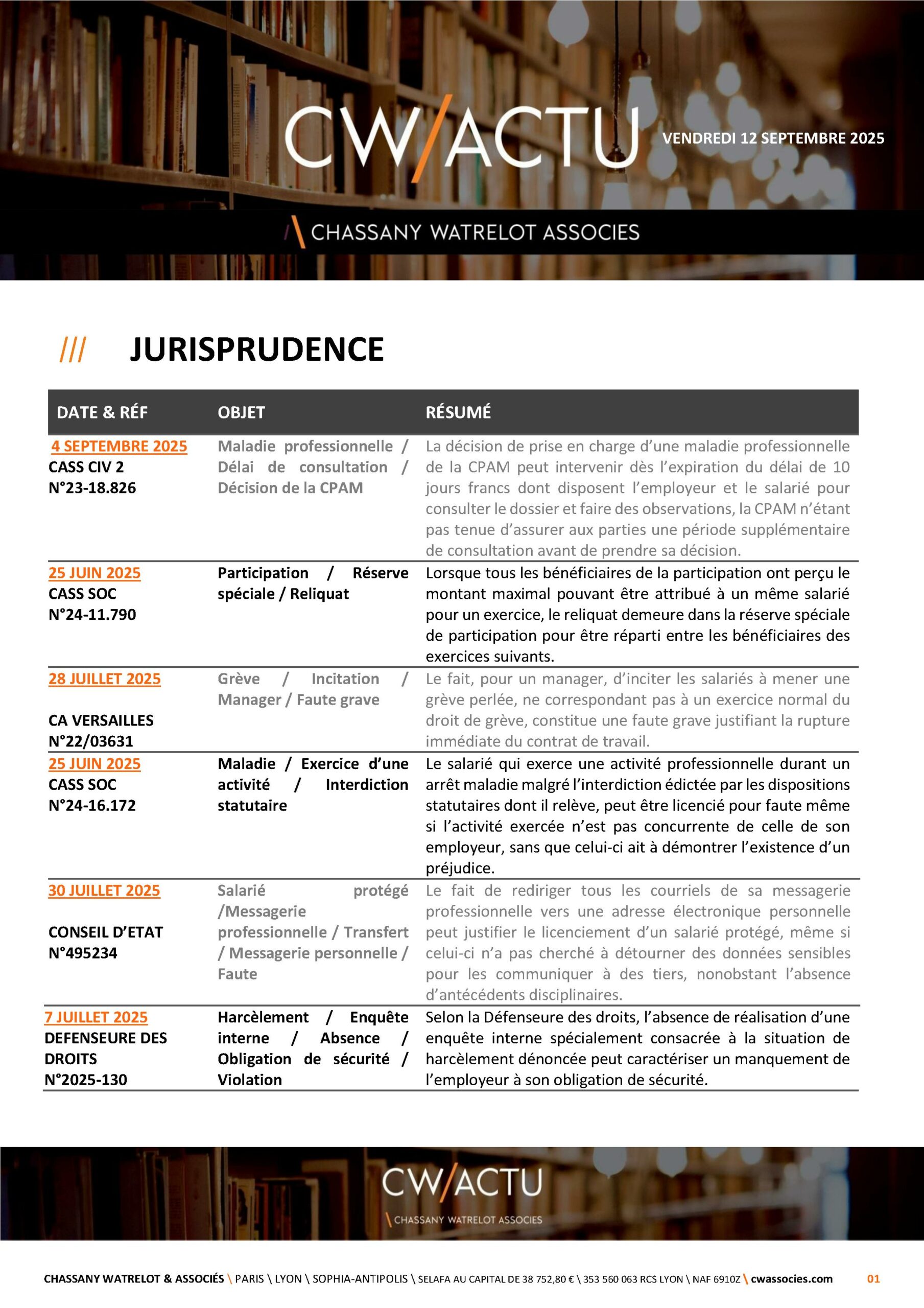 CW/ACTU : chaque semaine, Chassany Watrelot & Associés synthétise pour vous l’actualité légale, réglementaire et jurisprudentielle la plus récente en droit social.
